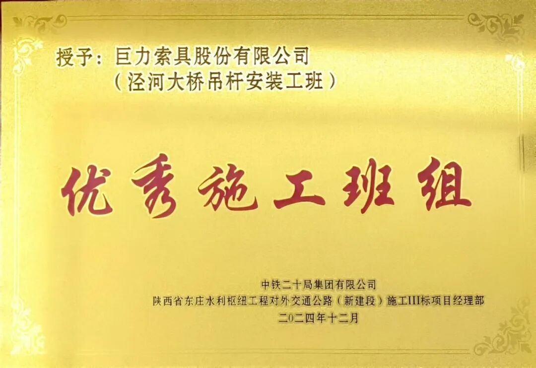 在吊索安裝環(huán)節(jié),巨力索具團(tuán)隊積極優(yōu)化作業(yè)流程,對吊索安裝張拉后的穩(wěn)定進(jìn)行觀測,確保安裝進(jìn)度與質(zhì)量,為大橋的順利通車提供了關(guān)鍵保障。巨力索具團(tuán)隊也因出色的現(xiàn)場表現(xiàn),被項目部授予“優(yōu)秀施工班組”的榮譽(yù)稱號。